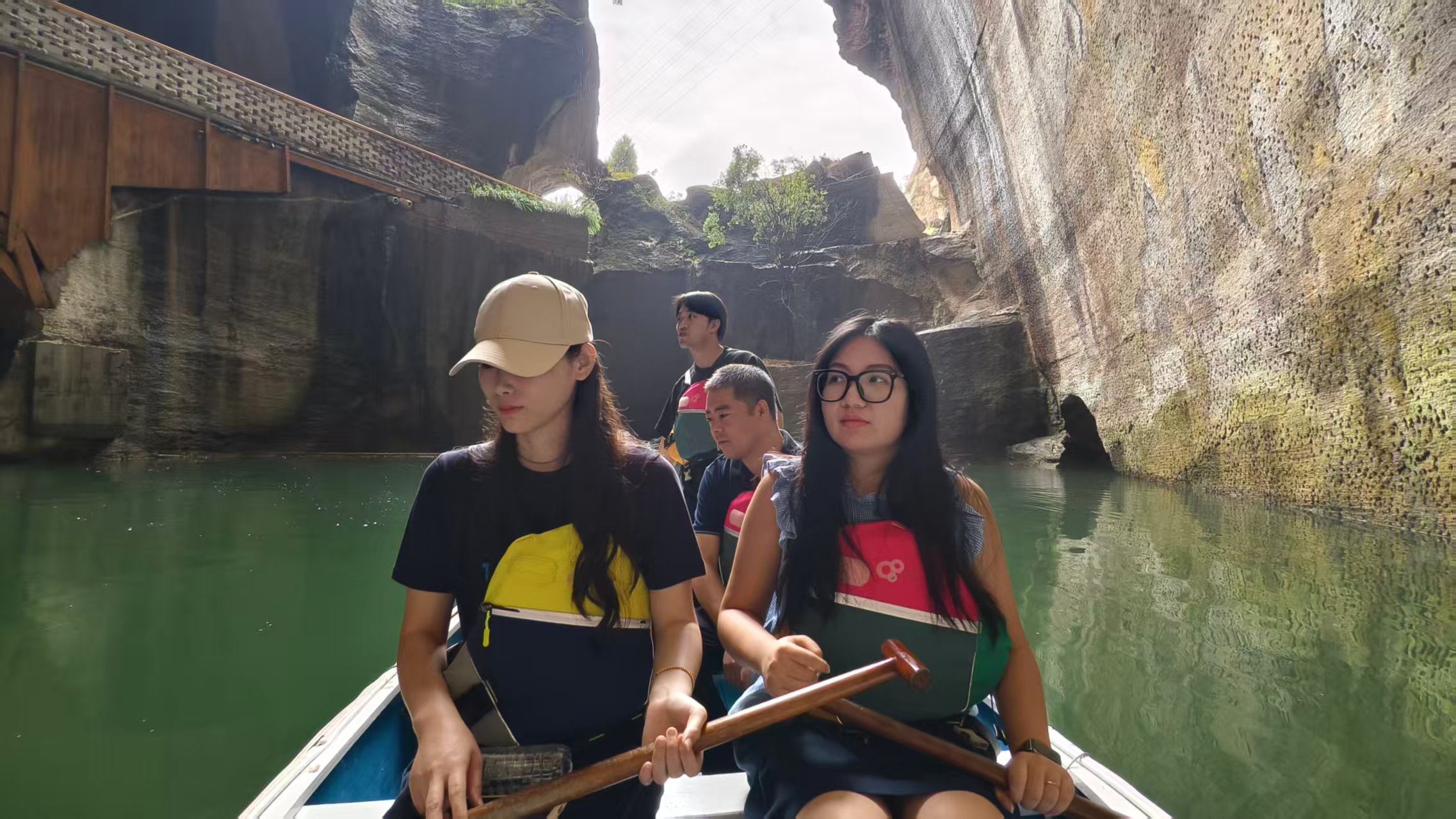 Einzigartiges „Bootfahren auf leeren Bergen“: Das Wasser im malerischen Gebiet ist vertikal und horizontal und Sie können mit dem Boot zwischen den Höhlen hin und her pendeln. Die grüne Wasseroberfläche steht in scharfem Kontrast zur rauen Felswand, als betrete man ein isoliertes, geheimes Reich, und das Fotografieren ist völlig abwegig.